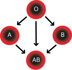 IA and IB are dominant over i, so ii people have type O, IAIA or IAi have A, and IBIB or IBi have type B. IAIB people have both phenotypes because A and B are codominant, which means that type A and B parents can have an AB child. Thus, it is extremely unlikely for a type AB parent to have a type O child (it is not, however, direct proof of illegitimacy): the cis-AB phenotype has a single enzyme that creates both A and B antigens. The resulting red blood cells do not usually express A or B antigen at the same level that would be expected on common group A or B red blood cells, which can help solve the problem of an apparently genetically impossible blood group.