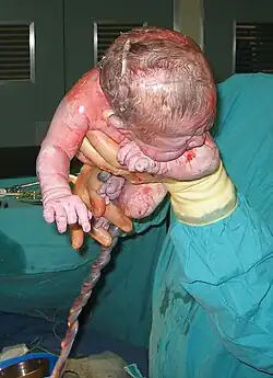 This condition happens when the umbilical cord is wrapped around the baby's head at least one or more times. This can be detected when a baby is in stress or by a simple ultrasound. In most cases the mother will have a cesarean delivery. In other cases the cord may be wrapped around the hands or feet.