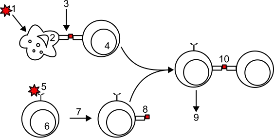 As B cells mature during embryonic development, they develop surface receptors that allow them to recognize specific antigens. Then they travel in the bloodstream, distributing throughout the lymph nodes, spleen, and tonsils. Once B cells reach their destination, they remain inactive until they encounter a foreign cell with an antigen that matches their particular receptor site (most B cells remain inactive for your entire life). The foreign antigen can be presented to the B cell directly, but usually macrophages and T cell lymphocytes (helper T cells) interact with B cells as Antigen Presenting Cells to bring about antibody production. Upon such an encounter, the B cell's receptors will bind to the antigen. The appropriate B cell is turned on or stimulated. It then grows bigger, and rapidly multiplies into a large homogenous group (clone). Most of these cells are plasma cells, which actively secrete antibody that will bind with the original stimulating antigen . While most of the B cells remain in the lymphatic system, the antibodies are secreted into the lymph fluid which then enters into the blood plasma to circulate throughout the body. Although the clone cells only live a few days, their antibodies remain and circulate in the blood and lymph, gradually decreasing in number.