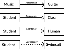 • the "uses-a" relationship, means that one object will use an instance of a class during one of its methods. For example, a Student Object might use a Book object while reading(), a Shelf Object might use a drill during building(), and a Human Object might use a Swimsuit Object and Towel Object during swimming().