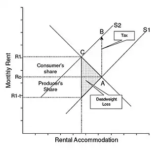 - If landlords try to raise rents by the amount of the tax, from A to B, there will be excess supply, rents fall and a new equilibrium at C