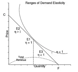 - For the straight demand curve, the ranges of elasticity are given by the formula: η = EF / CE