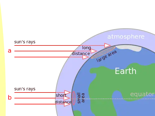 Hot, arid environments are found in the tropics. These areas receive direct sunlight in summer and winter. Hadley cells in the atmosphere also cause aridity as the warm moist air rises from the equator. This condenses and precipitates and the cooler air sinks over the tropical latitudes. The air is drier as cool air cannot hold as much moisture. The air then heats as it spreads over tropical regions and rises again. Hot, arid climates can also be found in rain shadows, mountainous regions with arid areas behind them. The mountains cause relief rainfall and then the dry air blows across the landscape drying it out.