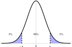 is the z-score corresponding to the percentage of the confidence interval. This can be looked up using the tables which occupy the last few pages of the data booklet or using the invNorm function on the calculator. Note, however, that entering invNorm(.9) will not give the Z-score of a 90% confidence interval. The remaining 10% must be distributed evenly both above and below the target range that is within 90% of the mean. Therefore z = invNorm(0.95). This can be clearly seen in the illustration above - we want to find the value of a, and should therefore use either 0.95 or 0.05. This is the same concept as a two-tailed test (described below) - if we were saying that 90% of the values were below a certain value, then we would use invNorm(0.9).