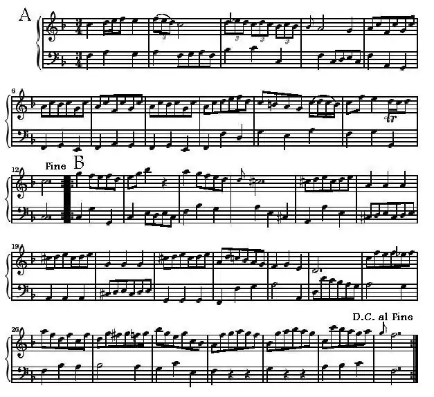 This Bach Minuet is in ABA Form. One plays the A section, plays the B section, and in a traditional minuet, starts back at the beginning and plays the A section over again.