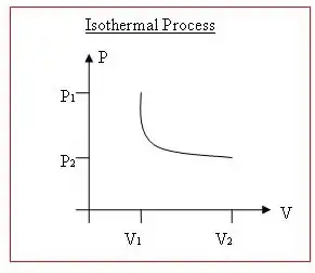 When work is done on/by a gas, or when heat is transferred into/out of it, both volume and pressure will normally change. Lines of equal temperature on a P vs. V graph curves, have asymptotes to both the x axis and the y axis. Higher temperature curves are further away from the origin.