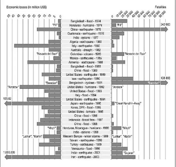 - Includes disasters with at least 2,000 people killed or US$10 billion of economic losses (2002 US$ value).
