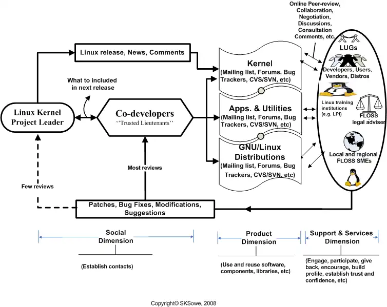 The figure below depicts how FOSS communities (for example the Linux kernel) and business enterprises may collaboratively co-exist to create a conducive business climate.