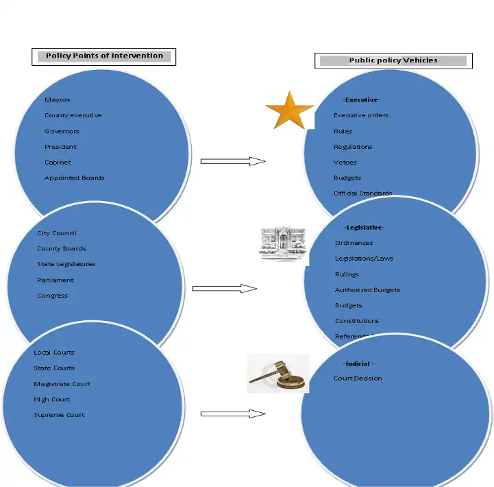 - Advocacy for public policy change involves a set of activities all designed to influence decisions. These decisions are embedded into various policies, laws, regulations, budgets etc. The are many ways to achieve this for instance through protest, media, public education, lobbying etc. These forms of advocacy are suited to particular situation and have own advantages and disadvantages. Below is a diagram showing typical intervention points in advocacy and the associated policy vehicles they seek to influence.