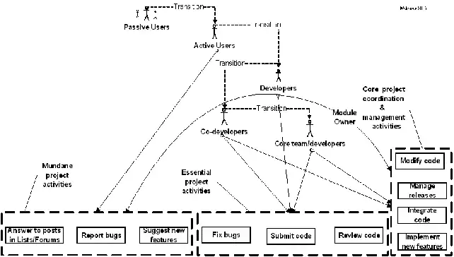 •Discussion: Use your knowledge of how FOSS communities work to discuss role transitions of FOSS community members in the figure below.