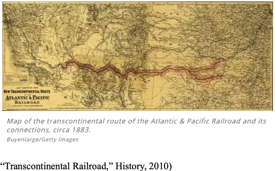 6.) History.com Editors. “Transcontinental railroad completed, unifying United States.” History, November 24, 2009. https://www.history.com/this-day-in-history/transcontinental-railroad-completed.