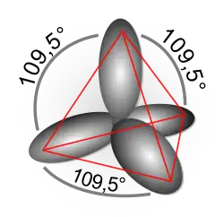 Chemist Linus Pauling first developed hybridisation theory[2] in order to explain the structure of molecules such as methane (CH4). Pauling pointed out that a carbon atom forms four bonds by using one s and three p orbitals, so that "it might be inferred" that a carbon atom would form three bonds at right angles (using p orbitals) and a fourth weaker bond using the s orbital in some arbitrary direction. In reality however, methane has four bonds of equivalent strength separated by the tetrahedral bond angle of 109.5°. Pauling explained this by supposing that in the presence of four hydrogen atoms, the s and p orbitals form four equivalent combinations or hybrid orbitals, each denoted by sp3 to indicate its composition, which are directed along the four C-H bonds.[3] Historically, this concept was developed for such simple chemical systems but the approach was later applied more widely, and today it is considered an effective heuristic for rationalizing the structures of organic compounds. It gives a simple orbital picture equivalent to Lewis structures. Hybridisation theory finds its use mainly in organic chemistry.