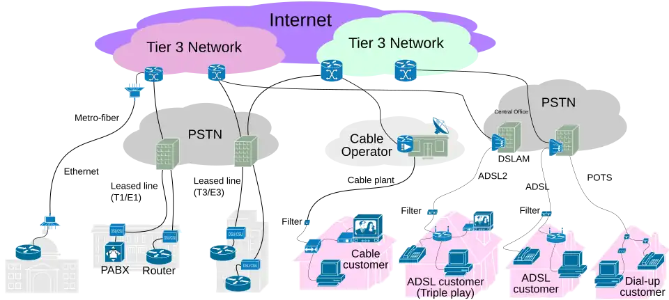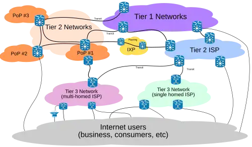 In the simplest case, a single connection is established to an upstream ISP and is used to transmit data to or from areas of the Internet beyond the home network; this mode of interconnection is often cascaded multiple times until reaching a Tier 1 carrier. In reality, the situation is often more complex. ISPs with more than one point of presence (PoP) may have separate connections to an upstream ISP at multiple PoPs, or they may be customers of multiple upstream ISPs and may have connections to each one of them at one or more point of presence.