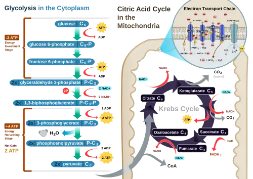 Power stations convert the energy in coal to electricity, which drives the computations of electronic computers. Living cells have their own built-in power stations to provide energy for their computations. Cell respiration is a cascade of metabolic reactions (glycolosis, the Krebs cycle and the electron transport chain) that transfer the energy of the intricately bound bonds of glucose into the more immediately utilisable ones of ATP.