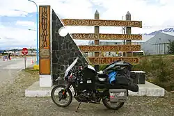 Ushuaia (Argentina) - Ushuaia is famous for being the World's southernmost city (although the title has been regularly challenged by the nearby Chilean town of Puerto Williams). It is located at the Southern tip of South America, on the island of Tierra del Fuego, at a Southern latitude of 54°48′, and only 1,000 km (660 mi.) Reaching Ushuaia away from the Northern tip of Antarctica. The city is considered by many riders to be a very significant milestone to reach when riding through the Americas, because of its unique geographical location and also because it evokes the tales of generations of bold navigators who attempted to cross the furious Cape Horn, nearby. Many riders chose to cross the entire Americas continental block by linking Ushuaia with Prudhoe Bay, Alaska (see this entry above), located at 70° of Northern latitude, thus covering a latitude span of 124° between the two locations, equivalent to a third of the Earth's circumference. Ushuaia's popularity is also enhanced by the fact that it is fairly accessible through the good Argentine roads of Patagonia.