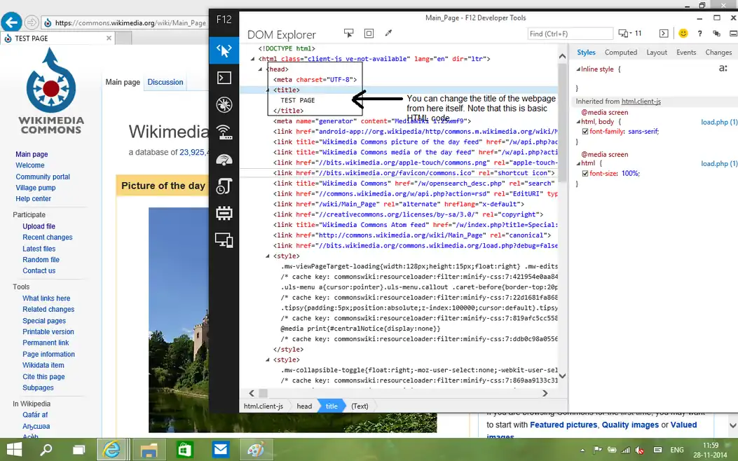 For instance, here we'll change the title of Wikimedia Commons. Locate the <title> part of the webpage (this is where the title of the webpage is taken from) and change it to whatever you like.