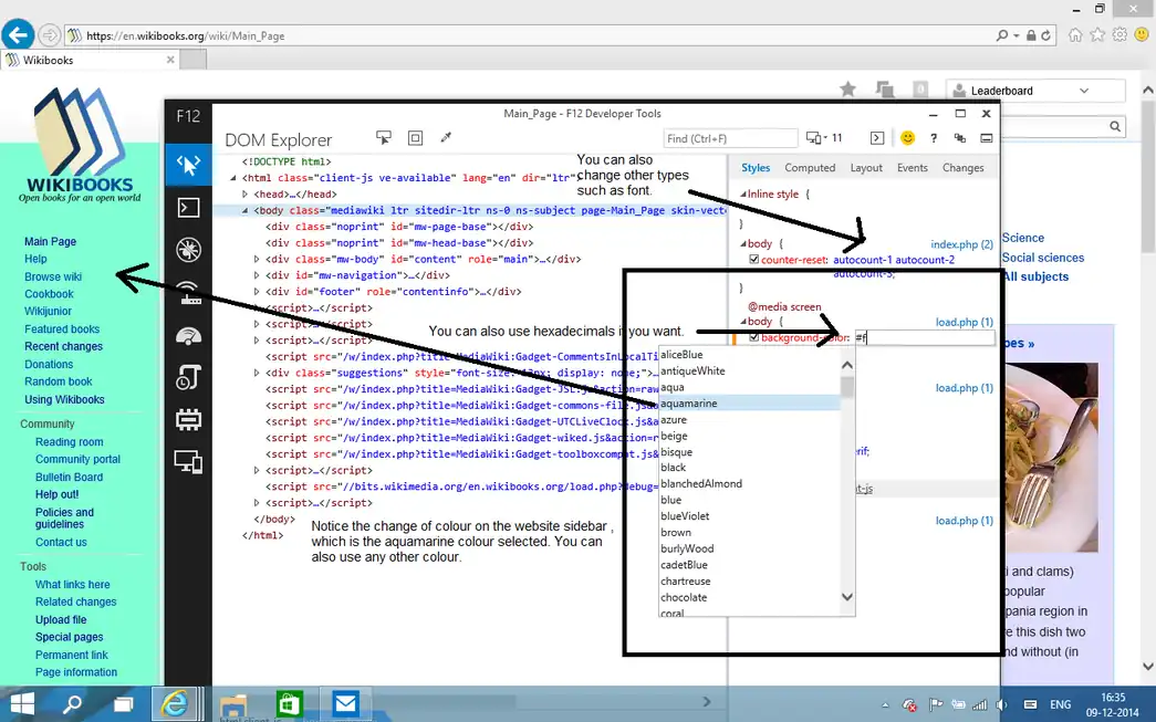 The Style tab allows you to test changes to different style properties of the webpage. This includes font, colour etc. However, as before you cannot make the change permanent. Here, we're changing the colour of the Wikibooks sidebar to aquamarine.