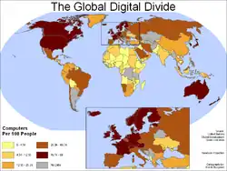 The Global Digital Divide is an issue that our world seems to be facing more and more as time goes on. Like the US Digital divide, it is a comparison of groups of people with access to technology but on a global scale instead of a country scale. The problem arrises when one country's people has more access to technology and /or communications than another country. Most developed countries have a majority of their population with some access to technology, however it seems that many developing countries lack the technological accessibility that the others have. The largest problem caused by this is the lack of education. The internet today is such a source of information that one could potentially gain their entire college degree while hardly ever stepping foot in a classroom. Many people around the world lack the opportunity to gain an education because of their lack of access to the internet and other technology that would help them to learn things at a faster, easier, or more efficient rate. The internet has so many uses: school courses, communication, language tutoring, translations, calculations, and so many more.[28]