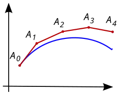 Illustration of the Euler method. The unknown curve is in blue, and its polygonal approximation is in red.