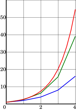 Illustration of numerical integration for the equation Blue is the Euler method; green, the midpoint method; red, the exact solution, The step size is h = 1.0.