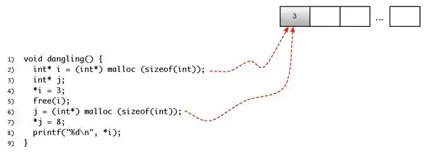Now, let's stop for a bit and think of what happens on line 6). First, assume we are using a first fit strategy to allocate variables in the heap. From that assumption, as the first block of memory (the one previously used by i) is free, we can allocate j on it. And that's what happens, as we show below.