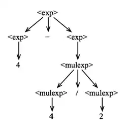 According to this grammar, the expression 4 - 4 / 2 has two different derivation trees. In the one where the expression 4 - 4 is more deeply nested, we have that 4 - 4 / 2 = 0. On the other hand, in the tree where we have 4/2 more deeply nested, we have that 4 - 4 / 2 = 2.