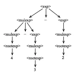 By adding the mulexp node into our grammar, we have given division higher precedence over subtraction. However, we might still have problems to evaluate parsing trees unambiguously. These problems are related to the associativity of the operators. As an example, the expression 4 - 3 - 2 can be interpreted in two different ways. We might consider 4 - 3 - 2 = (4 - 3) - 2 = -1, or we might consider 4 - 3 - 2 = 4 - (3 - 2) = 3. The two possible derivation trees that we can build for this expression are shown below: