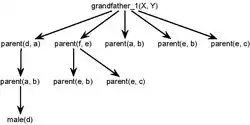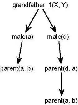 The second predicate is more efficient. To see why, notice that there are two clauses that unify with male(X) in our database of predicates: male(a) and male(b). Thus, the search tree for grandfather_2 starts with two nodes. Each of these nodes, which unifies with parent(X, Y), can have up to two nodes only, either parent(a, b) or parent(d, a), for a and d are the only atoms that satisfy male(X).
