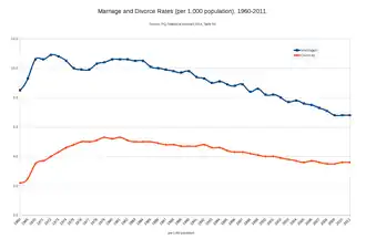 Another factor that contributes to high divorce rates is the change in laws that made divorce easier in the 1970s in the U.S.[49] The introduction of "No-fault divorce" laws removed the burden of proving that one's spouse had caused irreparable damage to the relationship (through adultery, battery, etc.). Women's rights advocates pushed for this change as it facilitated women's ability to exit unhealthy marriages.[49] Other factors that may have also contributed to the rise in divorces is a cultural mystique that suggests marriage should be blissful and not have any problems.[49] This is a common depiction of marriage in media, but is far from an accurate portrayal.[49] The unrealistic expectations many couples bring to marriage heightens the probability of divorce if things don't align with those expectations.