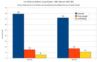 In the 1950s, most people believed that single-parent households were "immoral," but by 1978, only 25% of Americans held that belief.[4] Legal reforms in the 1960s and 1970s expanded the rights of nonmarital children and unwed mothers, breaking down the distinction between "legitimate" and "illegitimate". Additionally, the declining purchasing power of male wages in the 1970s along with the increased levels of education among women led to an increasing percentage of married women (with and without kids) to enter the workforce. This change in the economic structure of the U.S. (i.e., the inability to support a nuclear family on a single wage), had significant ramifications on family life. Women and men began delaying the age of first marriage in order to invest in their earning power before marriage by spending more time in school. The increased levels of education among women - women now earn more than 50% of bachelor's degrees - positioned women to survive, economically, without the support of a husband. By 1997, 40% of births to unmarried American women were intentional, and, despite a still prominent gender gap in pay, women are able to survive as single mothers.[4]