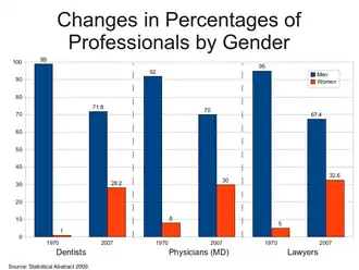 Another often studied difference between men and women is educational attainment. For a long time, higher education (undergraduate and graduate education) was an exclusively male bastion. Women did eventually gain access to institutions of higher learning, but parity or equality on a number of levels has still not been achieved. One measure of educational attainment where women have made great inroads is in college attendance. In 1960, 37.9% of female high school graduates enrolled in college, compared with 54.0% of male high school graduates. In 2002, more female high school graduates were enrolling in college than males, 68.4% of females vs. 62.1% males.[4] Women have, in fact, made significant progress in this respect. Women now earn more Bachelors and Masters degrees than do men, and for the first time in 2009, they earned more PhDs.[5] Women have made significant inroads into some of the traditionally most prestigious professions as well: 40% of medical school graduates are women and women make up large percentages of law school students as well.[24]