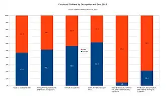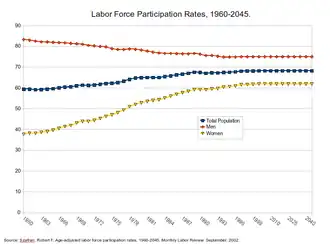 Current U.S. labor force statistics illustrate women's changing role in the labor force. For instance, since 1971, women's participation in the labor force has grown from 32 million (43.4% of the female population 16 and over) to 68 million (59.2% of the female population 16 and over).[1] Women also make, on average, $17,000 less than do men.[2] Women tend to be concentrated in less prestigious and lower paying occupations[22] that are traditionally considered women's jobs (also referred to as pink collar jobs).[3] Finally, women are not paid the same wages as men for similar work, a pay gap that exists in every developed country in the world.[23] This difference is often illustrated as a ratio, as shown in the graph below. Women tend to make between 75% and 91% of what men make for comparable work, though it depends on how the comparison is made. For instance, college educated women between 26 and 45 earned 74.7 cents in hourly pay for every dollar men in the same group made in 2005.[24] However, if you compare women and men with similar profiles and qualifications, the gap is smaller: women make about 91% of what men make, at least they have since the 1980s.[24] In the 1970s, similarly qualified women made only 82% as much as their male counterparts.