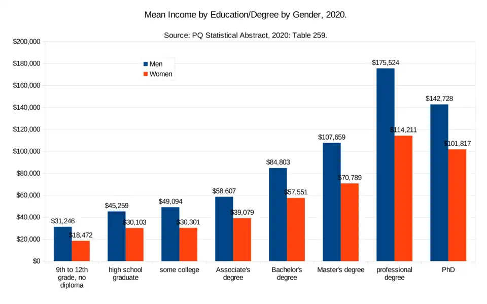 The differences in income between men and women mentioned above are partially due to discrimination, but also due, in part, to some women (including highly educated women) choosing to leave the labor force and stay home with their young children. Leaving the labor force doubly impacts income: (1) It takes away immediate income, and (2) reduces experience and tenure, lowering future earning potential. Additionally, while women have made significant inroads into many highly paid fields (e.g., medicine, law), the influx of women into those fields has slowed since 2000.[24] Reflecting sexism in US culture is a recent finding that when women are successful their male partners feel threatened, whereas women feel better about their relationships when their male partners succeed.[38]