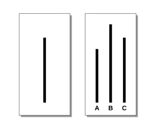 Research participants would enter a room and sit at a table with several other people (who were confederates, meaning they were actually helping with the research). The participant and confederates would be shown one card that had a reference line and another card that had three comparison lines. Subjects were required to select the comparison line that corresponded in length to the reference line.