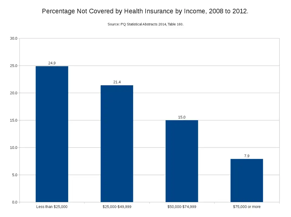 • As noted above, private insurance can be a boon to those who can afford the cutting edge technology. But the flipside to this boon is that the United States, the only mostly-private health delivery system in a developed country, is below average among developed nations by almost every health measure, including: infant mortality, life expectancy, chronic diseases and cancer survival rates.[23] As evidence of this, people in lower socioeconomic classes in the US are significantly more likely to contract a preventable disease than are people in higher socioeconomic classes, which is not the case in Canada, where they have universal healthcare.[24] This is directly attributable to reduced access to healthcare in the US for those with less money.