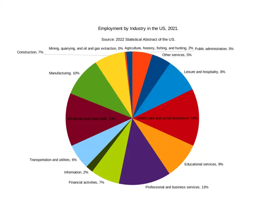Most highly developed countries are now post-industrial in that the majority of their workforce works in service-oriented industries, like finance, healthcare, education, business or sales, rather than in industry or agriculture. This is the case in the U.S., as depicted in the pie chart above.