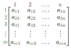 An (read 'm by n') is a matrix with rows and columns, and is the size of the matrix. The rows are counted from the top, and the columns are counted from the left.