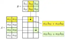(Matrix multiplication) Let and be two matrices. The matrix product of and is defined as the matrix whose th entry is If the number of columns of () is different from the number of rows of (), then the product is not defined.
