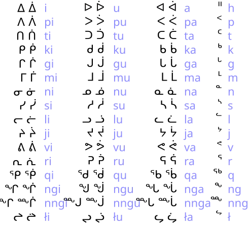 The syllabary used to write Inuktitut (Titirausiq Nutaaq). The extra characters with the dots represent long vowels; in the Latin transcription, the vowel would be doubled.