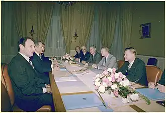 On the day of his arrival Khomeini made clear his fierce rejection of Bakhtiar's regime in a speech promising ‘I shall kick their teeth in.’ He appointed his own competing interim prime minister Mehdi Bazargan on February 4, `with the support of the nation’ and demanding ‘since I have appointed him, he must be obeyed.’ It was ‘God's government,’ he warned, disobedience against which was a ‘revolt against God.’[122] As Khomeini's movement gained momentum, soldiers began to defect to his side. On February 9 about 10 P.M. a fight broke out between loyal Immortal Guards and pro-Khomeini rebel Homafaran of Iran Air Force. Khomeini declaring jihad on loyal soldiers who did not surrender.[123] Revolutionaries and rebel soldiers gained the upper hand and began to take over police stations and military installations, distributing arms to the public. The final collapse of the provisional non-Islamist government came at 2 p.m. February 11 when the Supreme Military Council declared itself "neutral in the current political disputes… in order to prevent further disorder and bloodshed."[124][125] TV and Radio stations, palaces of Pahlavi dynasty and government buildings were then occupied by revolutionaries.