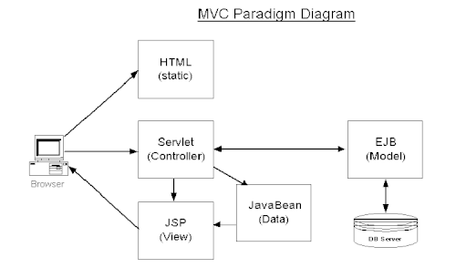 • The business logic (model) actually accomplishes the goal of the interaction. This might be a query or an update to a database. This could be handled by EJB technology.