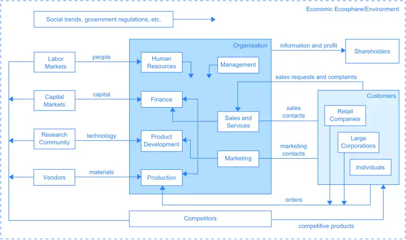 Life is a complicated mess of interconnected objects sending signals and messages. See the illustration below in figure 2 demonstrating a complex system for an economic ecosphere for a single company. Imagine what this system diagram would be like if you were to add a few more companies and their sub-systems. Computer software systems in general are a complex web of further interconnected sub-systems – where each sub-system may or may not be divided into further sub-systems. Each sub-system communicates with others using feedback messages – that is, inputs and outputs.