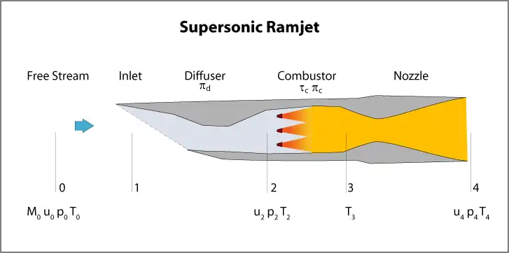 A ramjet uses the open Brayton cycle. In the above diagram a 2D supersonic intake is shown downstream of which is a divergent subsonic diffuser.