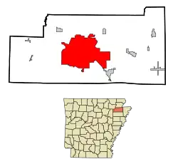 Nestled in the northeastern corner of Arkansas, Craighead County borders the Missouri Bootheel.[1] Jonesboro — which measures about 208.4 square kilometers (80.5 square miles) — is located atop Crowley's Ridge, "a geological formation" situated 76 to 170 meters (250 to 550 miles) above the Mississippi embayment alluvial plain.[1][2]