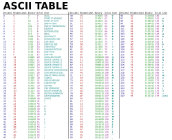 How many codes in total? Each character (or command) is represented as a number from 0 to 127. This is stored as a binary value in 7 bits. 1 bit is reserved for error checking.