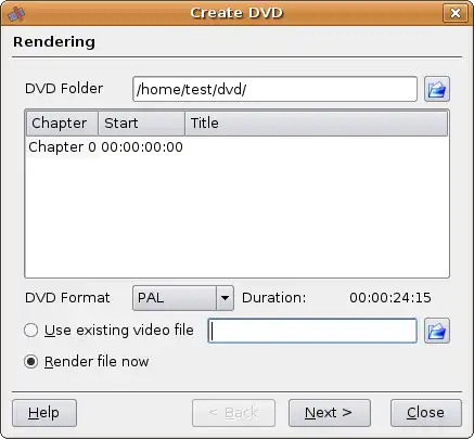 - In this screen you should enter the folder name where the DVD structure should be created and the DVD format (PAL/NTSC). Be sure that the option "Render file now" is selected.