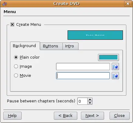 You can choose to use a plain colored screen for your menu (click on the color box to select it), an image file or even a movie file (enter the path and name if selected). Also, you can define a pause between chapters if you have created such.