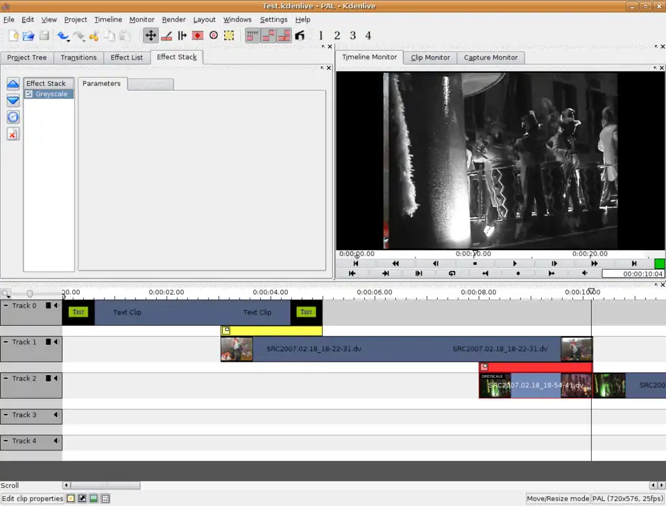 Effects are ways to change your original clip. Kdenlive comes with different effects that can be applied to the audio and others that can be applied to the video. The small number of standard audio effects can be easily increased if you use the Ladspa plug-ins (see this page to know how to load them).