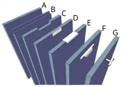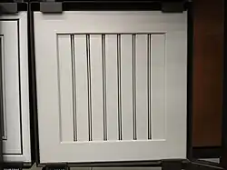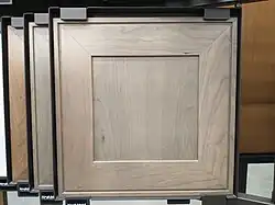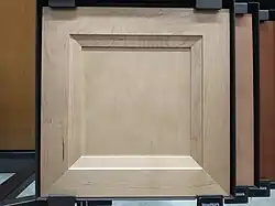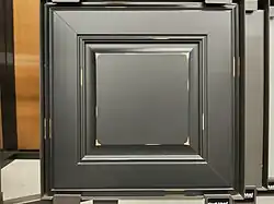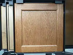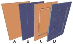 The traditional type of a cabinet front element in the United States is the panel door (see image: C), made out of four solid wood frame pieces which enclose a (thinner) panel. Slab doors are made out of one solid piece of wood or engineered wood (A) and commonly associated with a more modern appearance. Some doors, for example plank style doors, fit into neither of those categories.