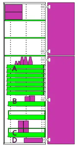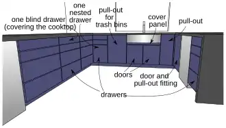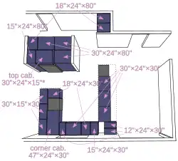 With the help of these data plus information about the available corner cabinet frames, I selected 22 cabinet frames for my kitchen (see image).